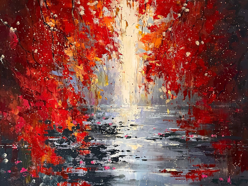 In this painting, I poured my passion into every vibrant stroke of red and orange, capturing the fiery dance of nature’s energy. The impressionistic style invites you to feel the warmth and movement, as if stepping through a glowing pathway. It’s a celebration of transformation and light, meant to ignite your spirit and bring dynamic energy and warmth to any space.